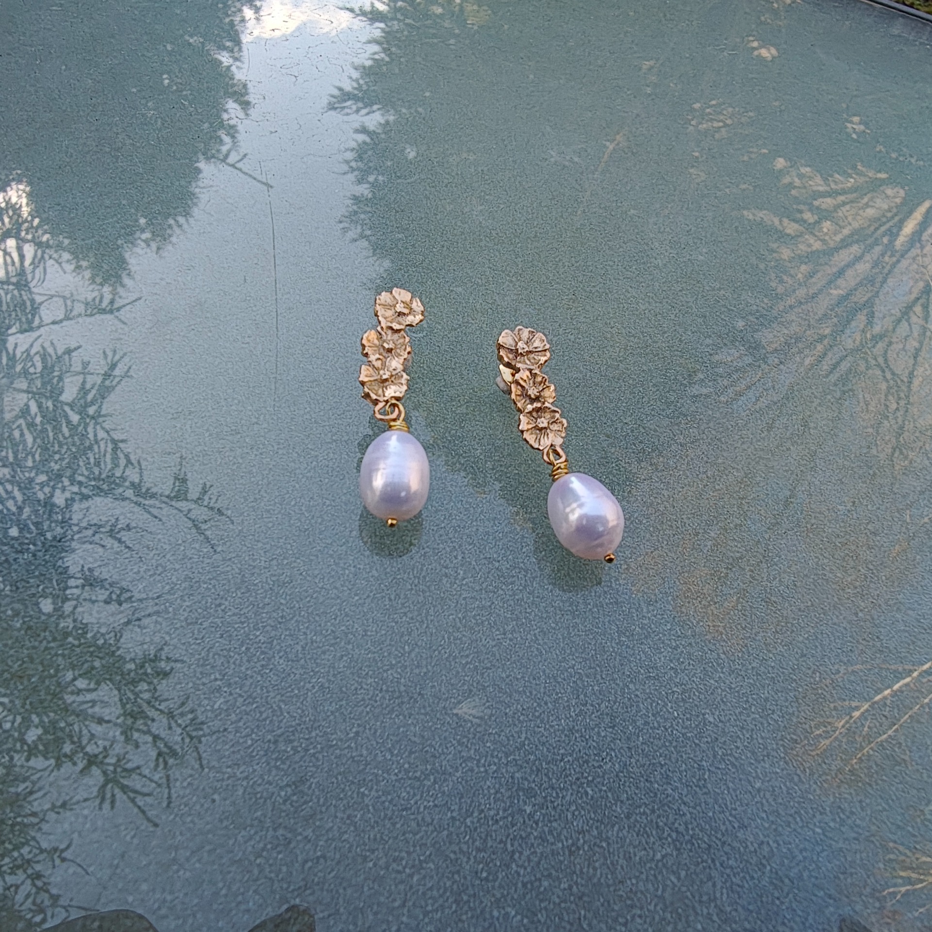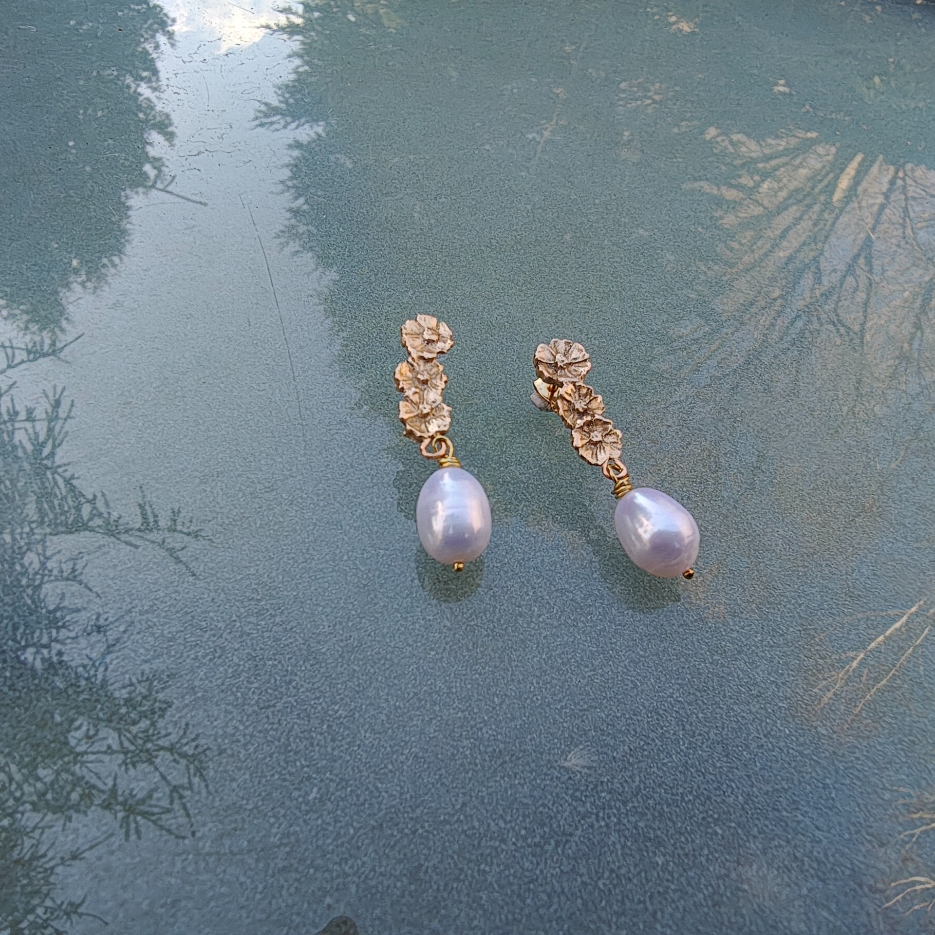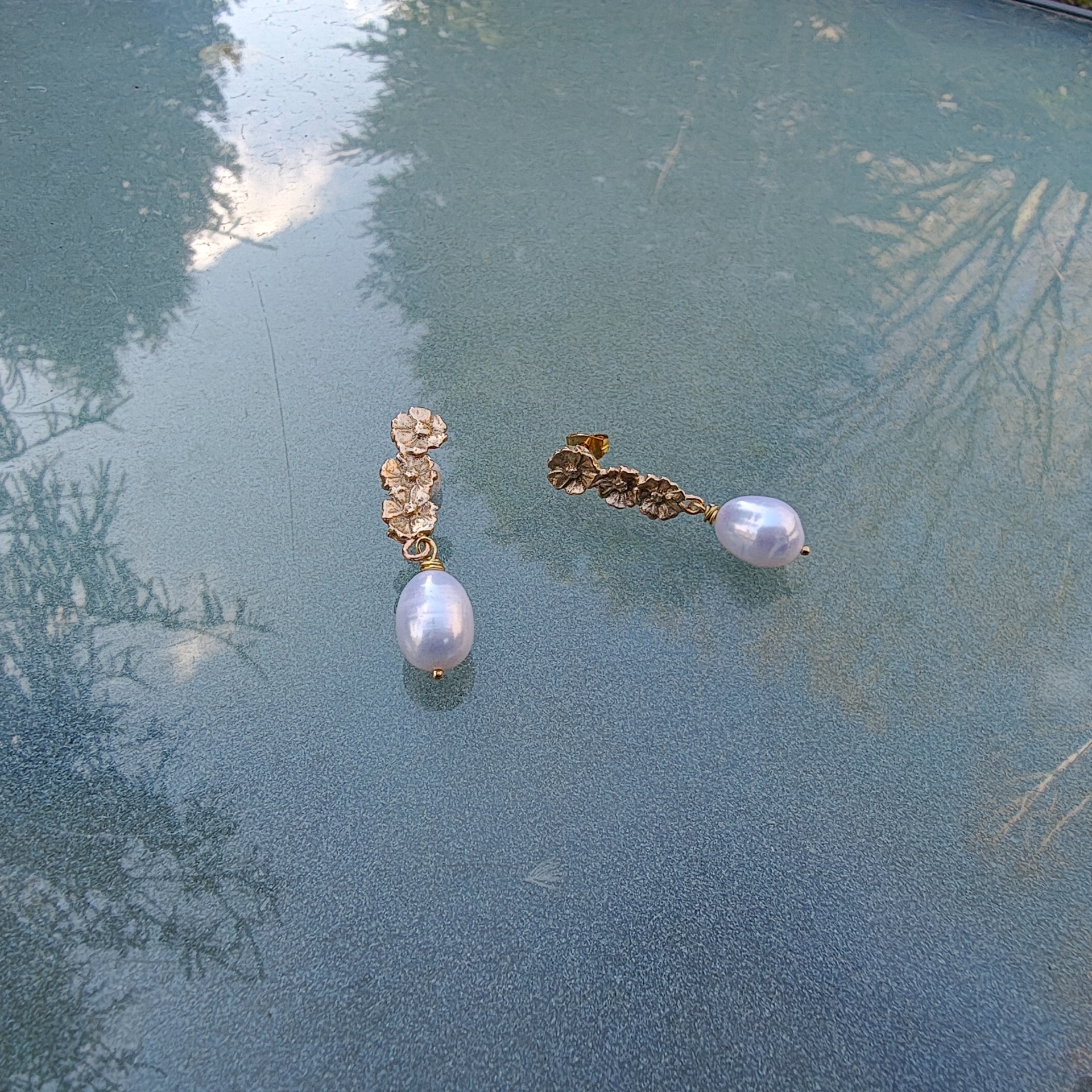 Fineste ørestikker med små blomster og fine ferskvandsperler. Øreringe er ca. 4 cam lang og ferskvandsperlen er ca. 1 cm.